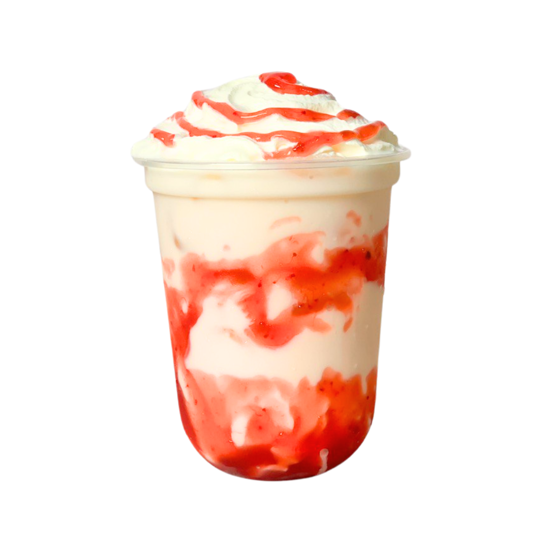 A smooth and creamy (1) cup of strawberry-flavoured iced drink, perfect for a sweet and fruity treat.